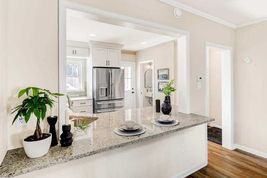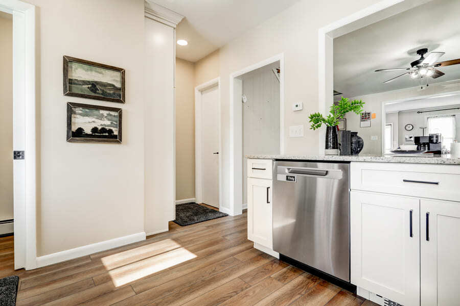 In the kitchen, we reworked the layout to create a more open connection to the adjoining room, including a passthrough with a countertop overhang that provides casual seating for homework and daily routines. New cabinetry was installed to increase storage and organization, and the portable dishwasher was replaced with a built-in unit for improved functionality. The space was further refreshed with new countertops, backsplash, fixtures, and updated flooring to create a cohesive, durable finish.