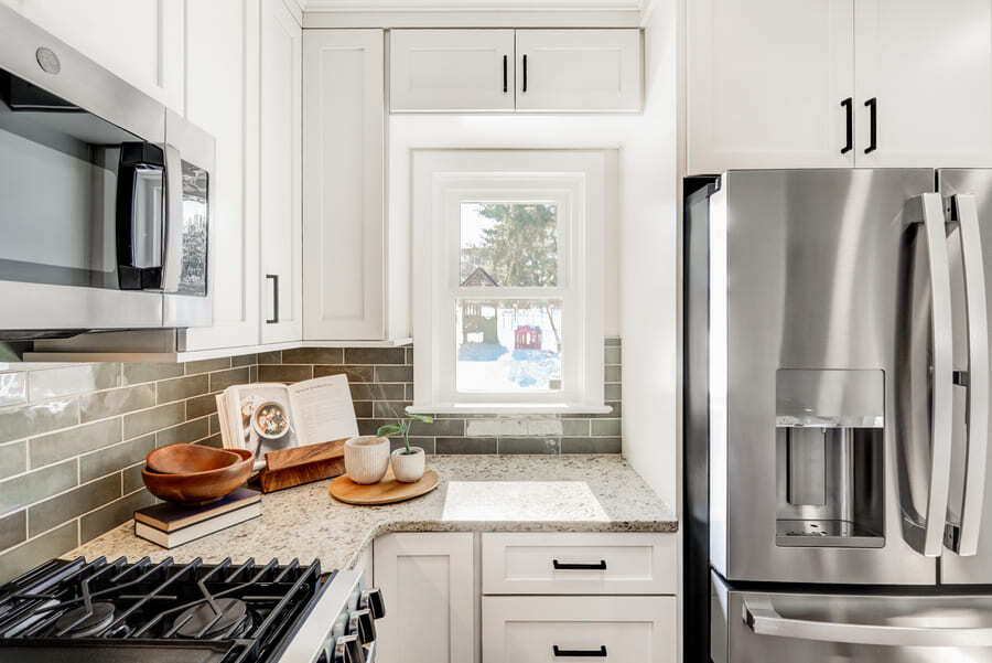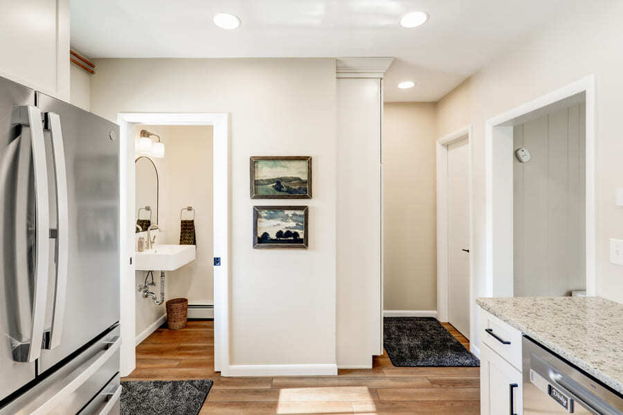 During Project Development, we explored several layout options to ensure the final plan balanced openness, storage, and the addition of the new half bathroom without compromising the kitchen’s functionality. Once the homeowners felt confident in the direction, the project moved smoothly into production. The pre-production phase, including the ordering of materials, determining product lead times, and scheduling with trade partners, spanned just over a month. Because the home is an older city property, additional coordination was required to plan for plumbing and venting, which we worked through with our trade partners early to avoid delays. With those details resolved, the project progressed steadily, resulting in a thoughtful transformation that supports the family’s needs today and into the future. Once construction began, this kitchen remodel was completed in approximately 12 weeks. While that timeline was longer than a typical kitchen remodel, holiday scheduling and the added scope of opening the layout and constructing a new half bathroom required additional coordination to ensure every detail was done right.