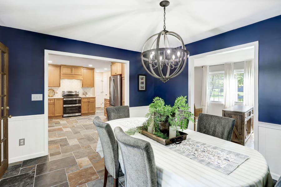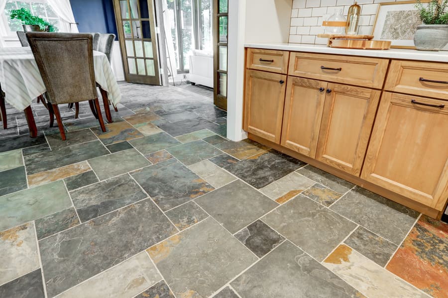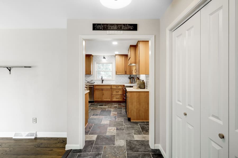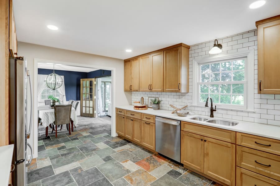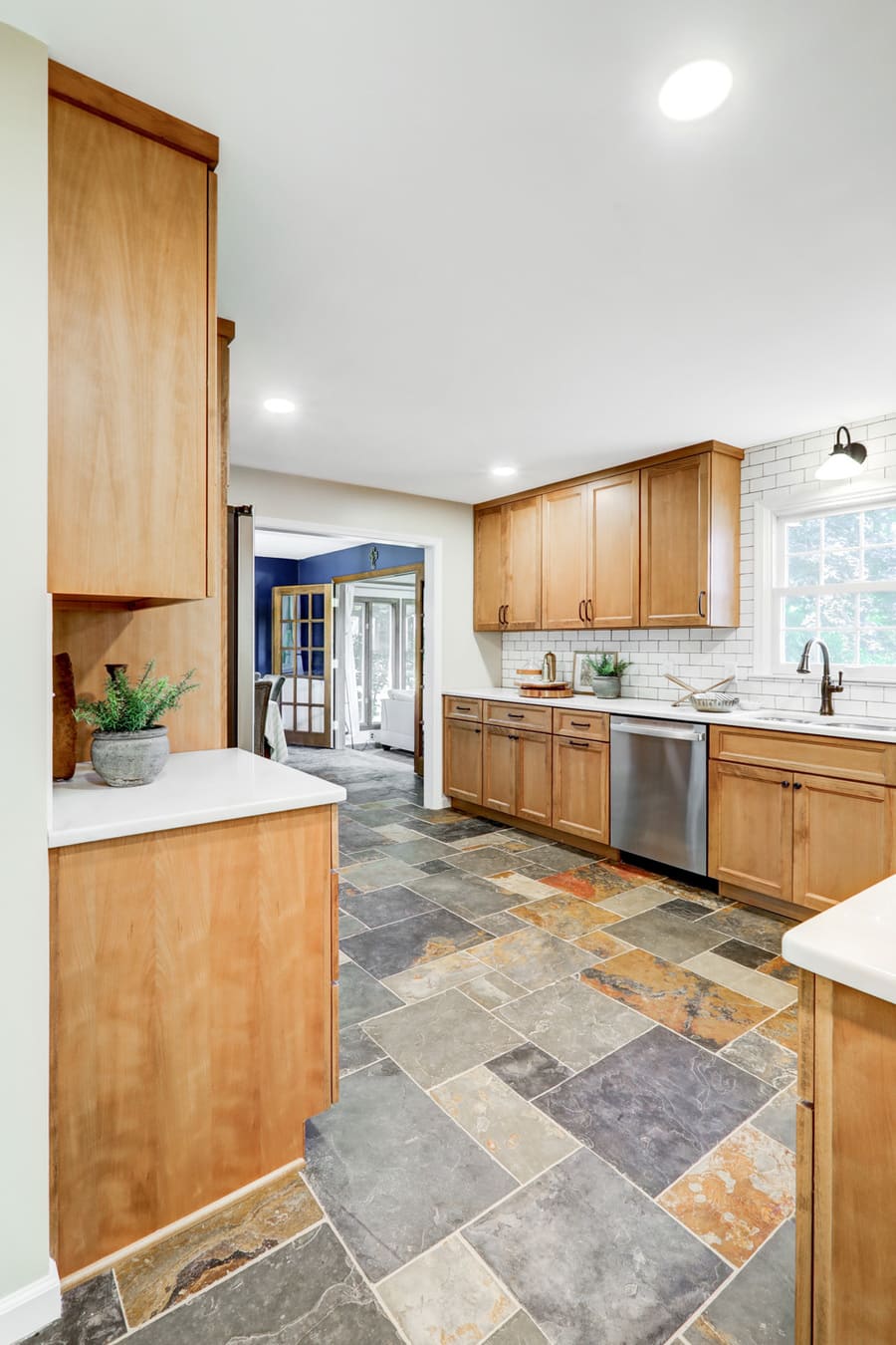 Slate flooring—an intentional, standout choice—was carried throughout the kitchen, dining room, and surrounding first-floor spaces to create a cohesive look.