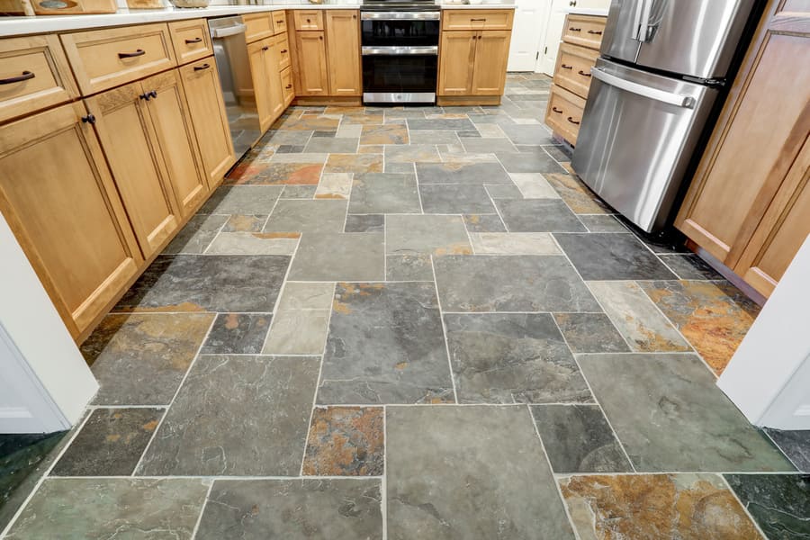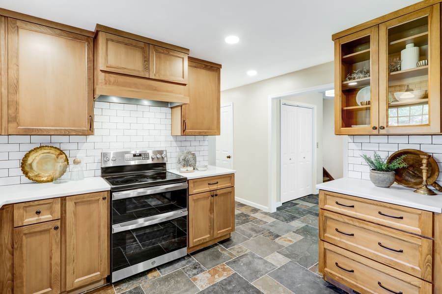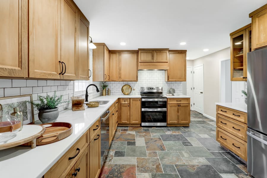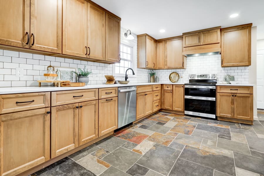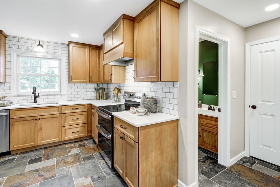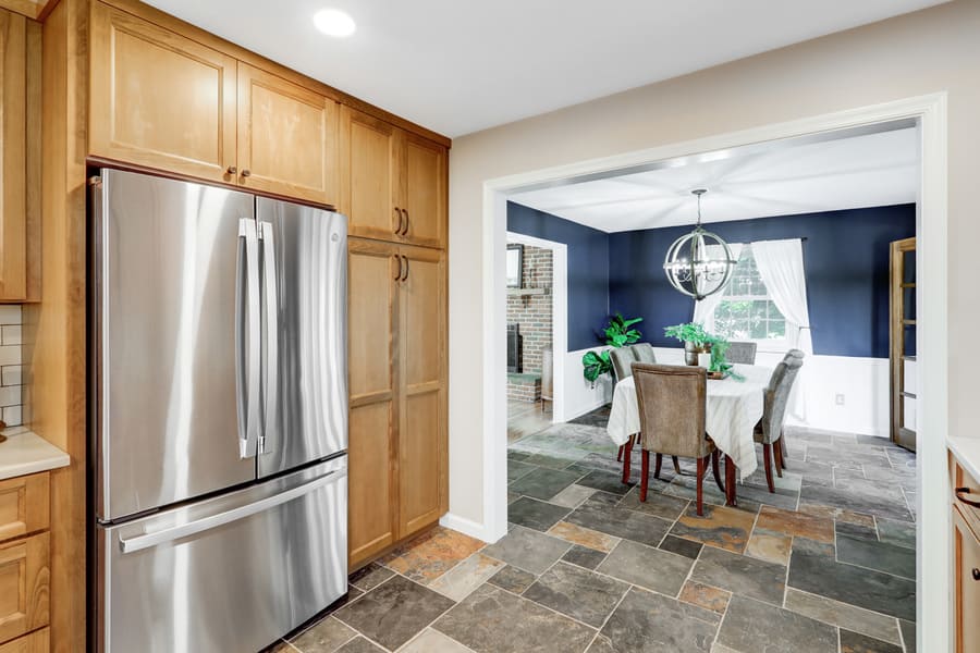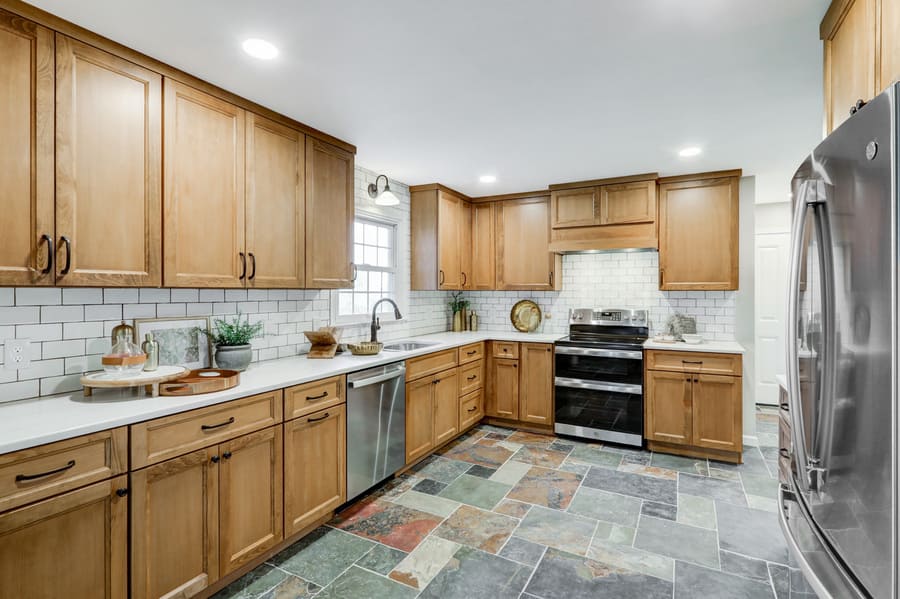 Slate flooring—an intentional, standout choice—was carried throughout the kitchen, dining room, and surrounding first-floor spaces to create a cohesive look.