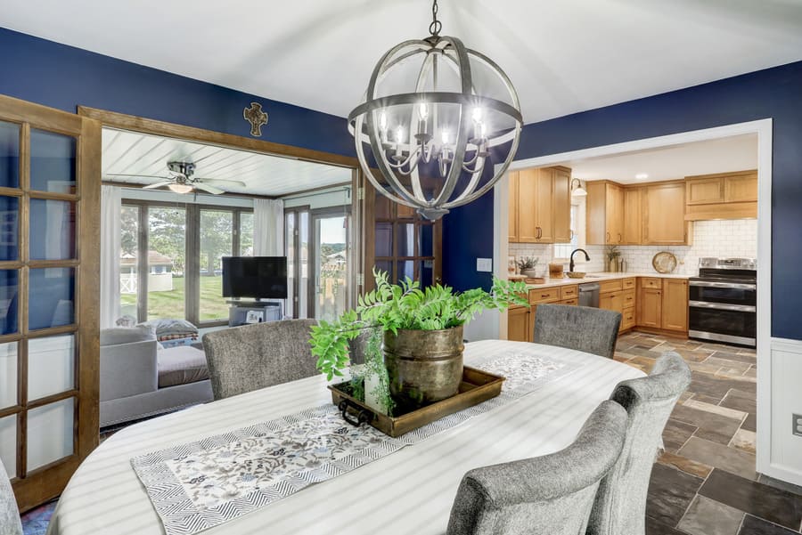 After exploring layout options, we expanded the kitchen into the opposite direction and repurposed the adjacent playroom into a dedicated dining room. This allowed for a more open, connected layout and maximized usable space. We widened the opening between the kitchen and dining room to improve flow and painted the dining room a rich navy blue to add depth and contrast.