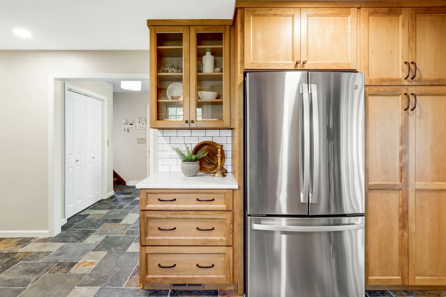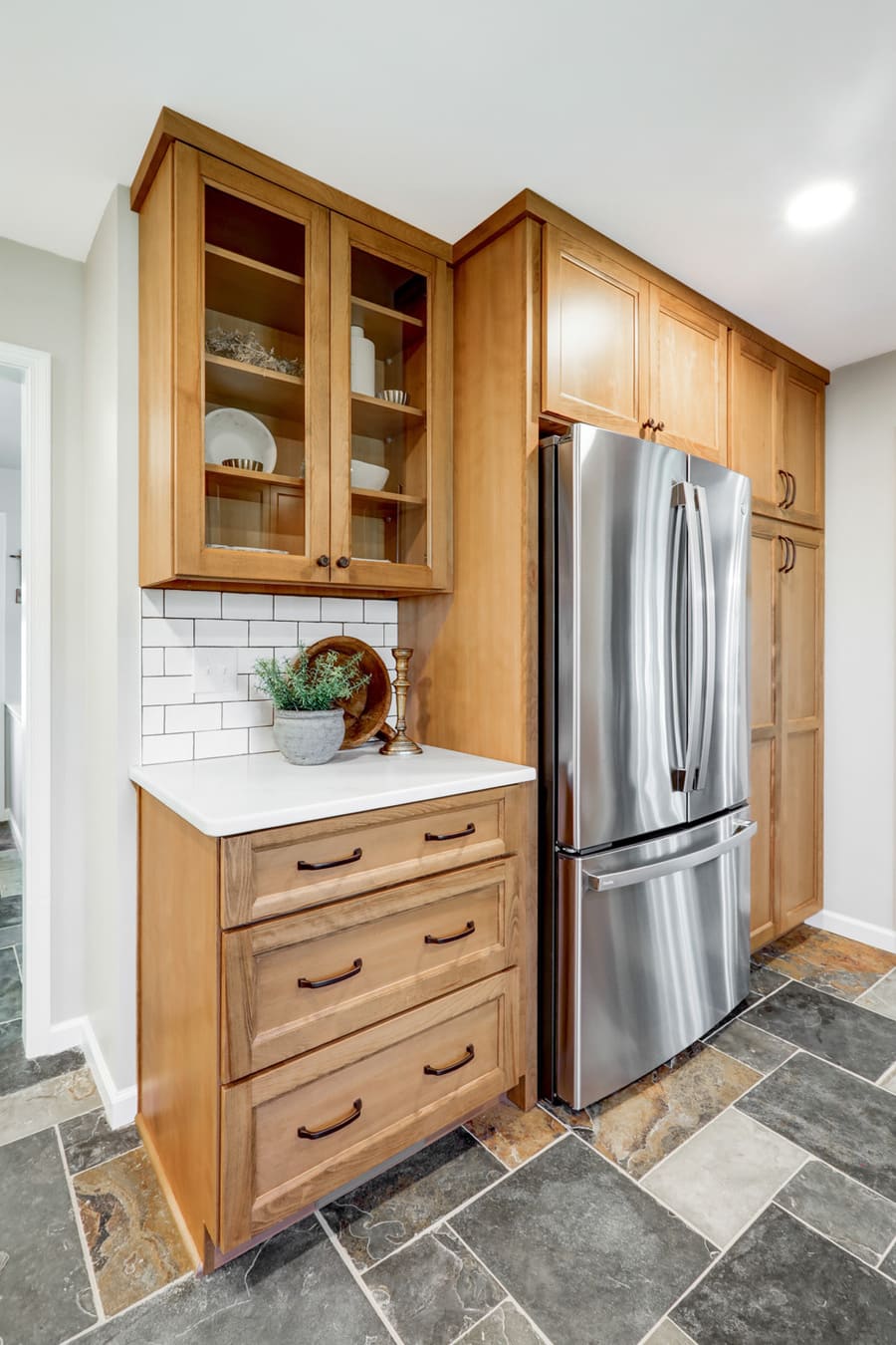 The homeowners were ready for a change — a space that felt natural, with craftsman character and thoughtful design. One of their must-haves? A dishwasher. Another? Making use of every inch of potential storage, especially above the fridge.