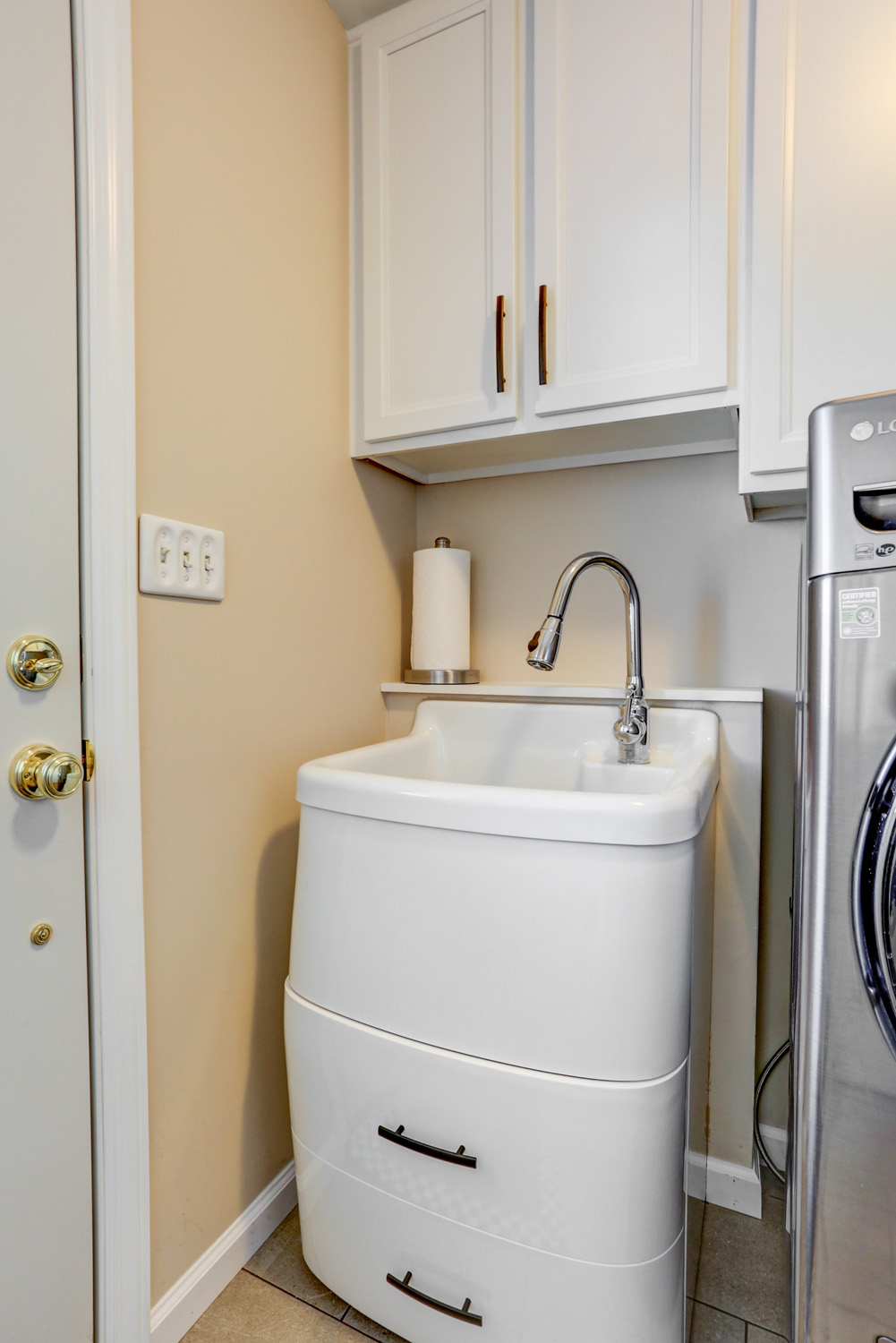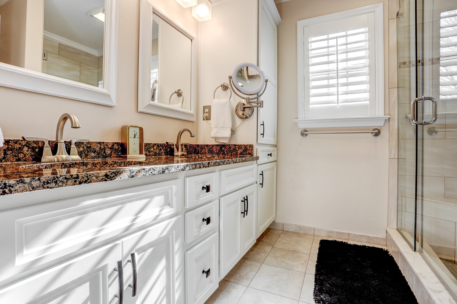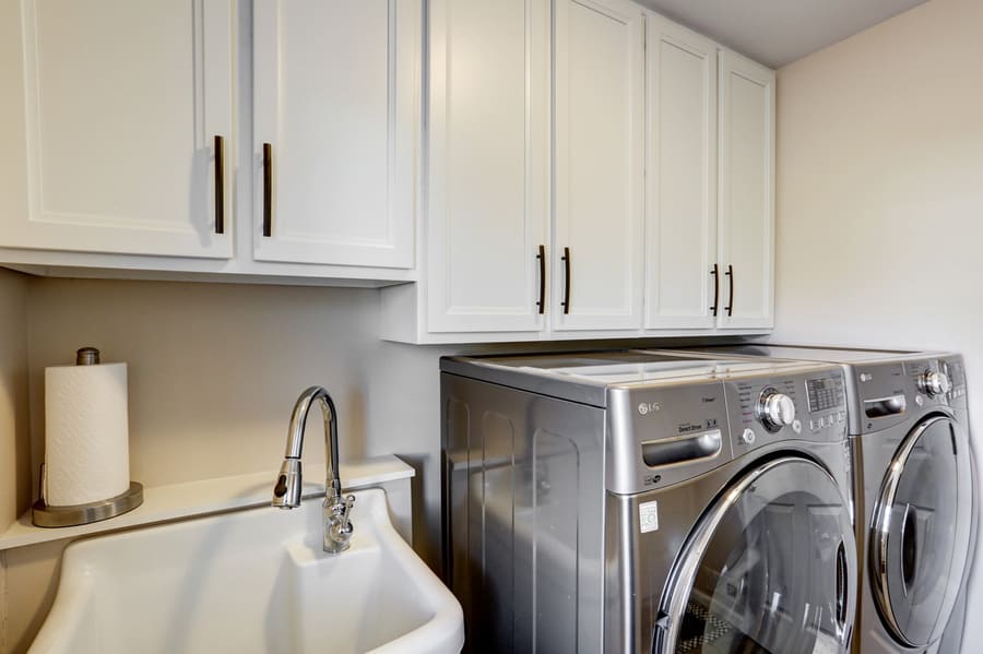 For this project, we updated cabinets and cabinet hardware in the laundry room, hall bathroom, and master bathroom. New and fresh white cabinets with bronze hardware are small changes that gave these spaces an updated and modern look.