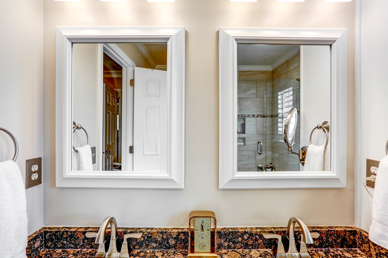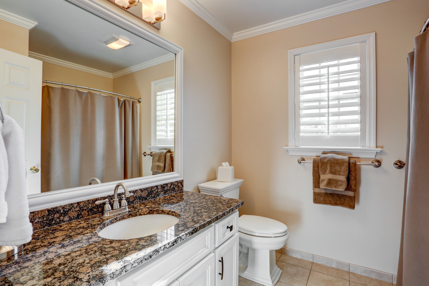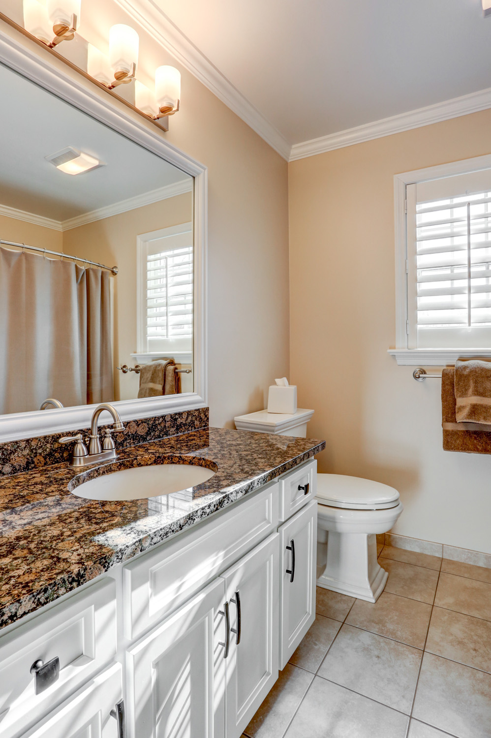 For this project, we updated cabinets and cabinet hardware in the laundry room, hall bathroom, and master bathroom. New and fresh white cabinets with bronze hardware are small changes that gave these spaces an updated and modern look.