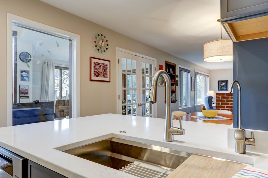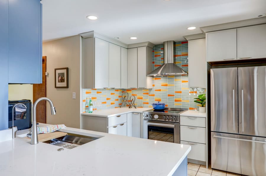 Electrical and lighting were reconfigured to accommodate the new design, including upgrading the electrical system for an induction range and enhancing the ventilation for the new hood. Brand-new cabinetry was installed, offering double the storage capacity and ensuring every inch of space was utilized efficiently. The backsplash area was tiled, new countertops were fitted, and a fresh sink and faucet were installed, all contributing to the kitchen's refreshed look.