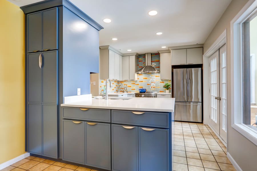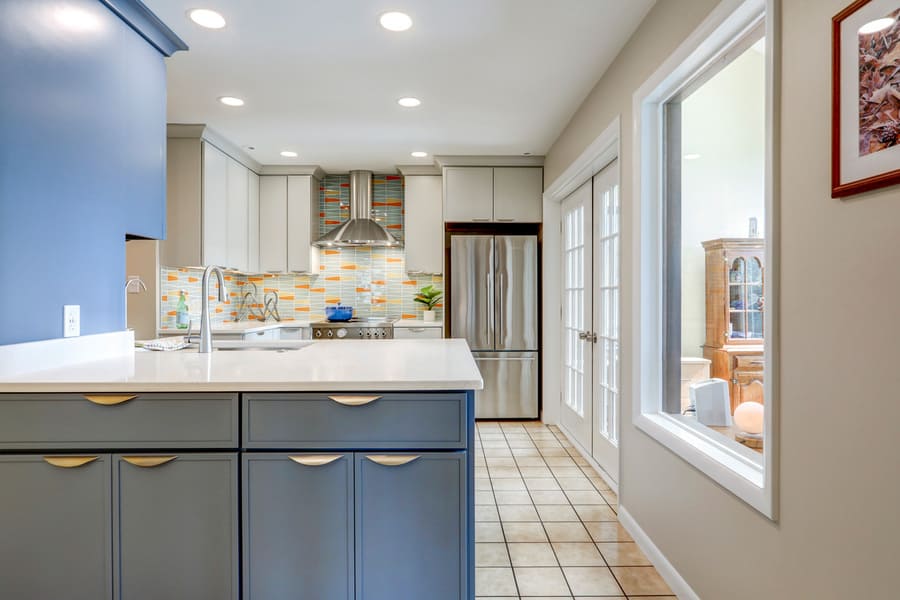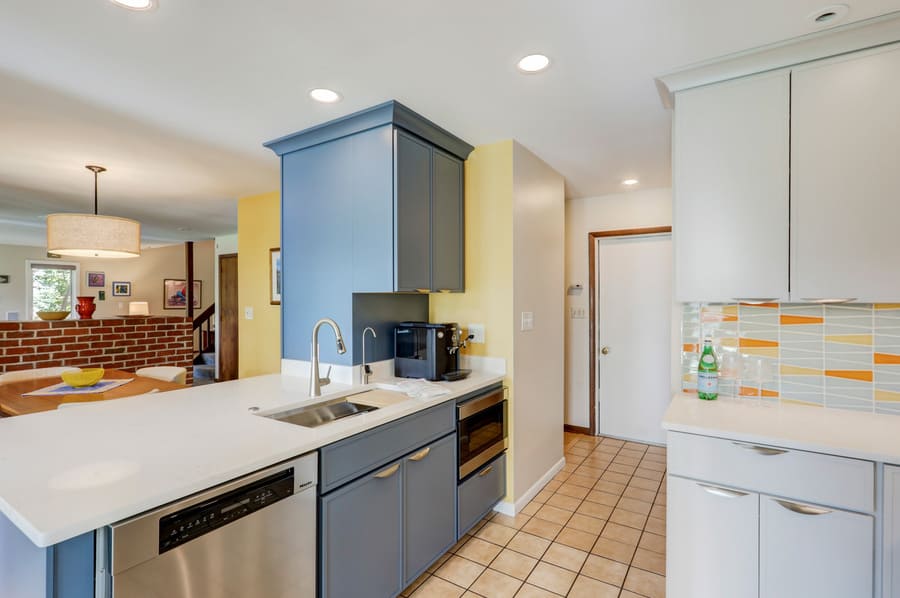 Key changes included removing the upper cabinets on the peninsula to open up the area, while simultaneously increasing storage in other areas, and making the stove wall a stunning focal point.