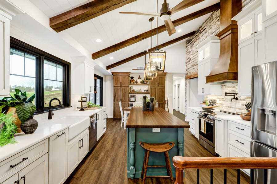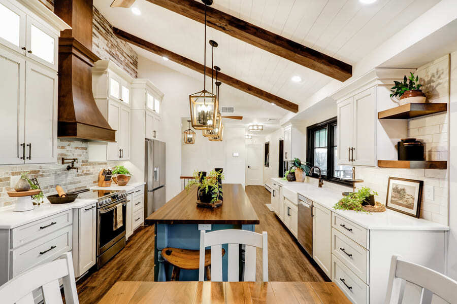 A vaulted ceiling was introduced to add height and architectural interest, finished with shiplap and exposed wood beams that bring warmth, texture, and a sense of character to the room. A statement island was designed as the centerpiece of the kitchen, offering generous prep space, seating, and additional storage while incorporating decorative posts for a furniture-style look. Custom cabinetry was installed and thoughtfully detailed to enhance the rustic aesthetic, complemented by a custom wood hood and faux brick accents that add depth and a subtle nod to traditional craftsmanship. Together, these updates created a kitchen that feels open, intentional, and rich with personality — a space designed to support both everyday living and meaningful gatherings.