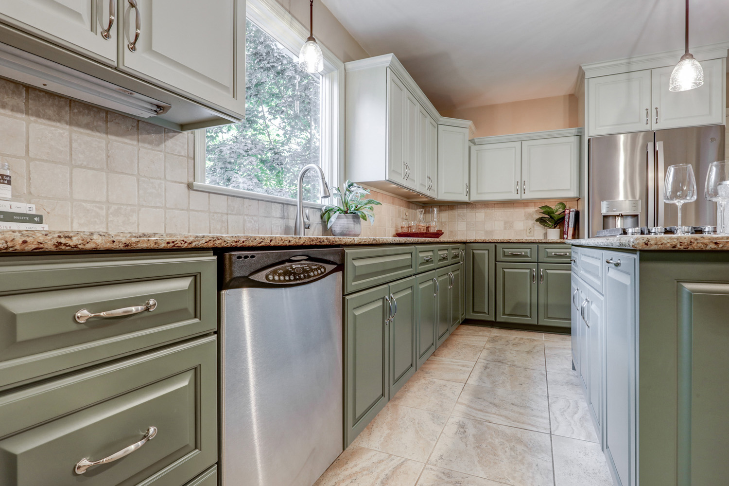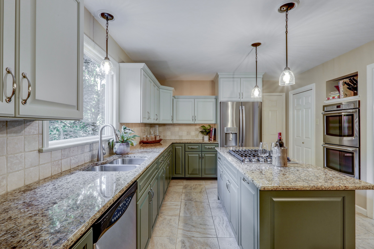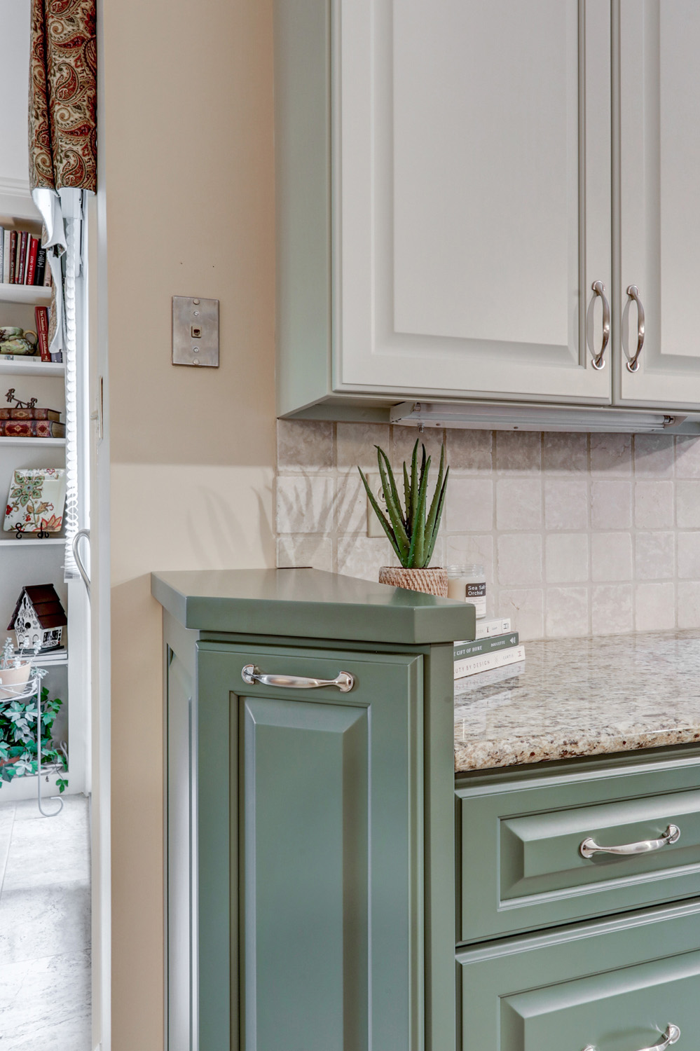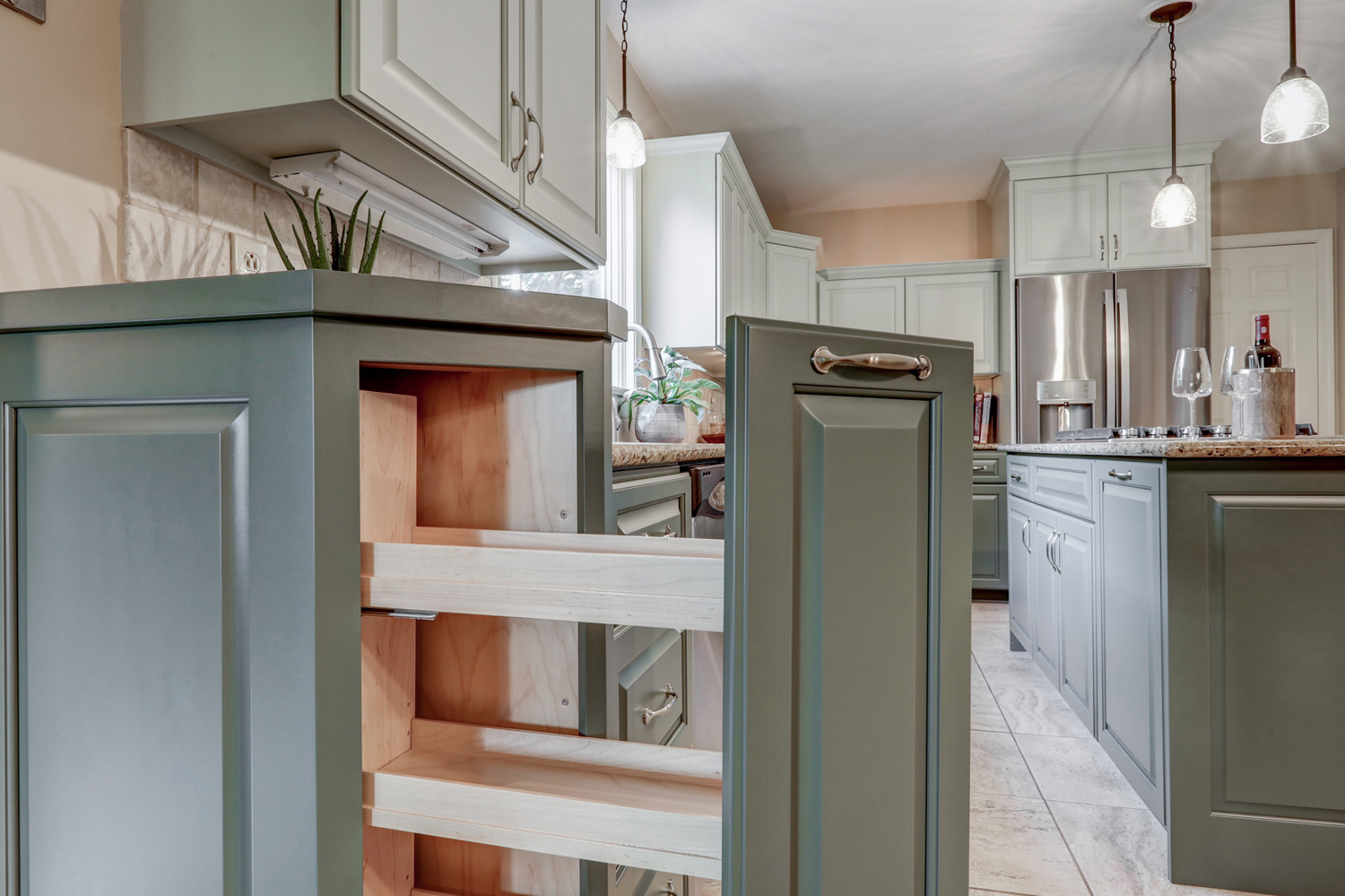 Steve and Susie had no idea they could have dual color cabinets in their kitchen, but once our designer brought the idea to them, they loved it! Since they were keeping the original countertop, they had to find a color that would work with the colors in the countertop. They were able to narrow it down to two; navy blue and sage green. They ended up going with the green for the lower cabinets and the island. For the upper cabinets, they chose a very subtle and lighter shade of green; still drawing in colors from the countertop and tying in the dark green from the lower cabinets.