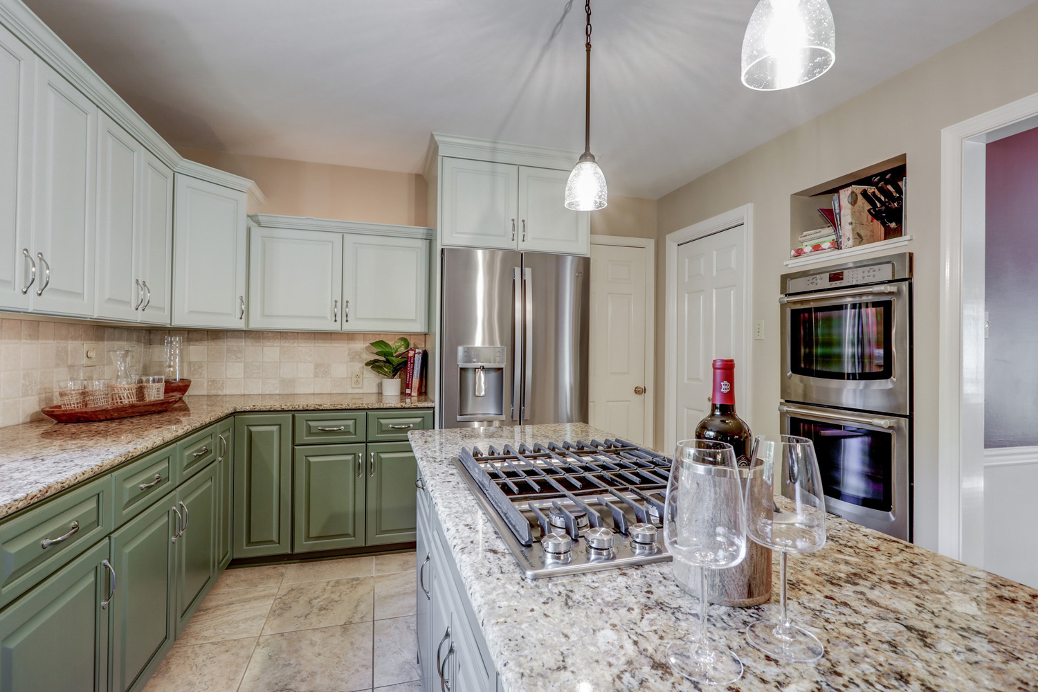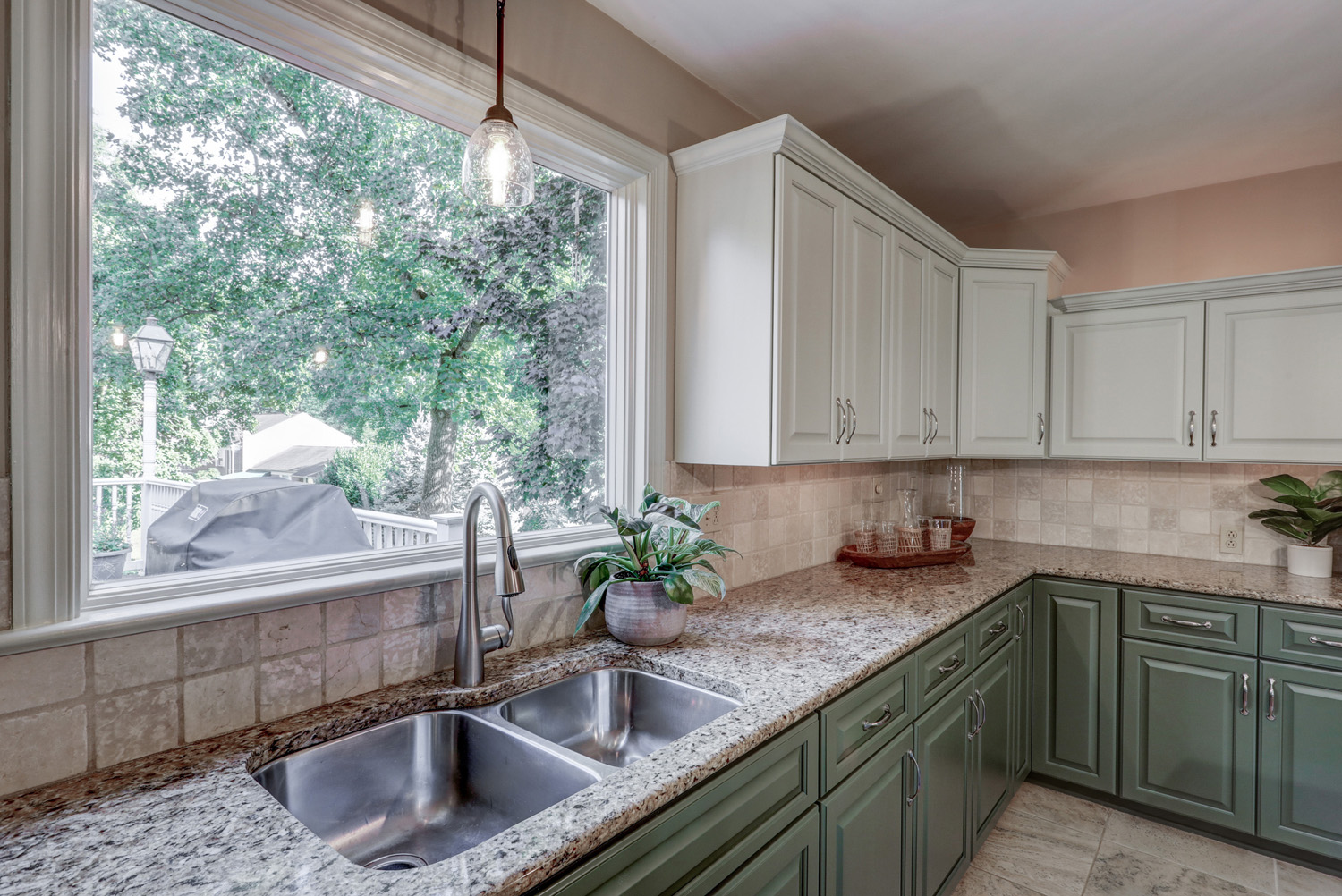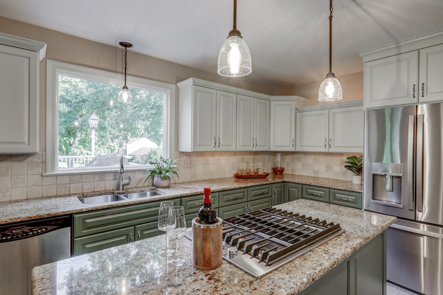Steve and Susie had no idea they could have dual color cabinets in their kitchen, but once our designer brought the idea to them, they loved it! Since they were keeping the original countertop, they had to find a color that would work with the colors in the countertop. They were able to narrow it down to two; navy blue and sage green. They ended up going with the green for the lower cabinets and the island. For the upper cabinets, they chose a very subtle and lighter shade of green; still drawing in colors from the countertop and tying in the dark green from the lower cabinets.