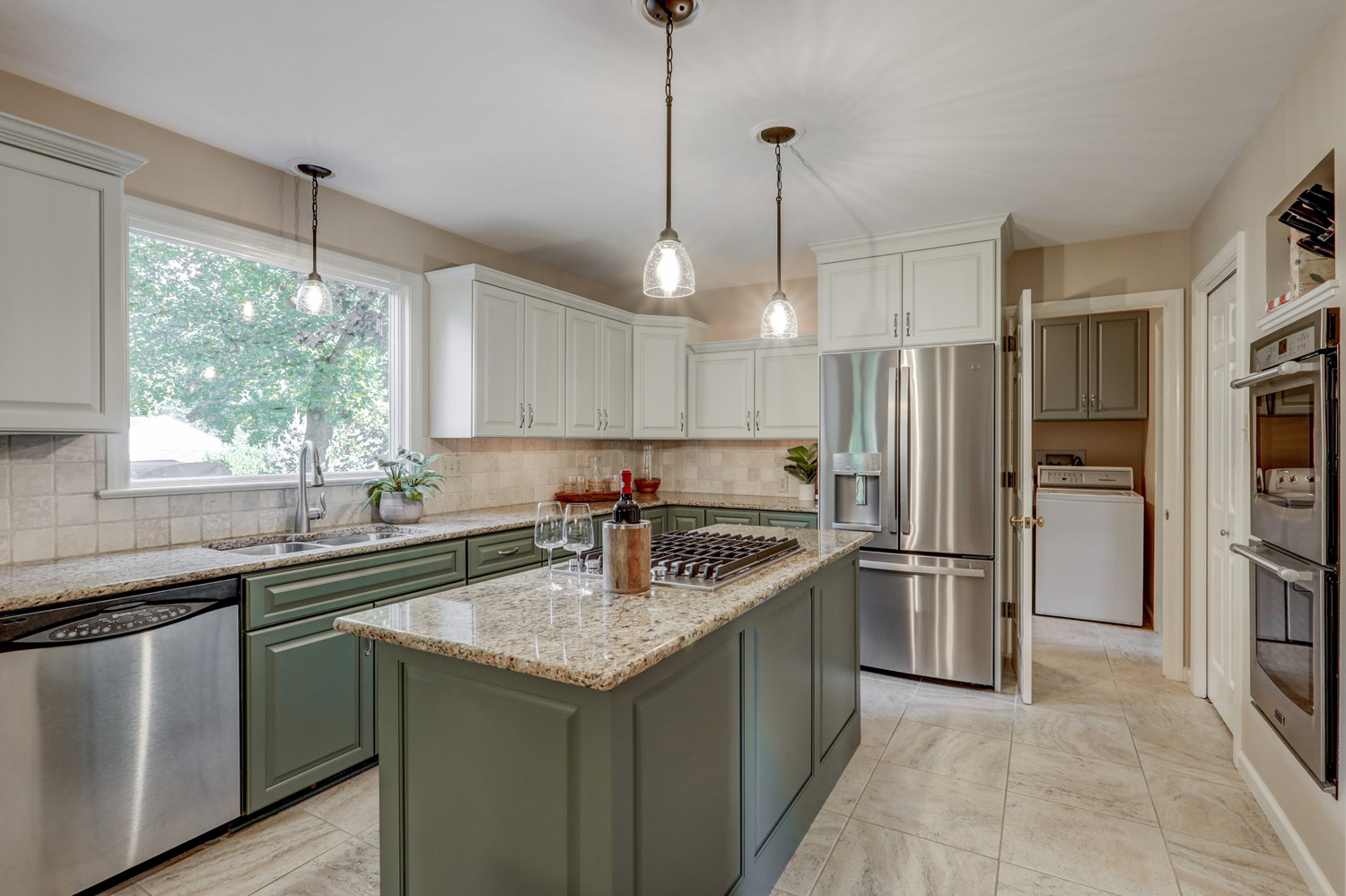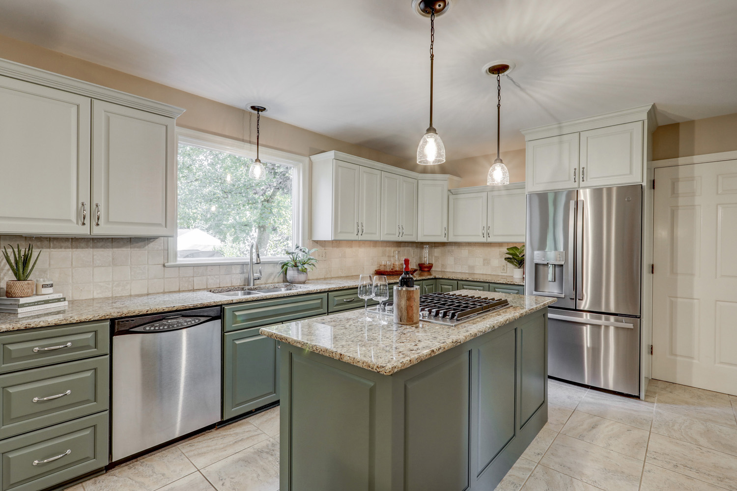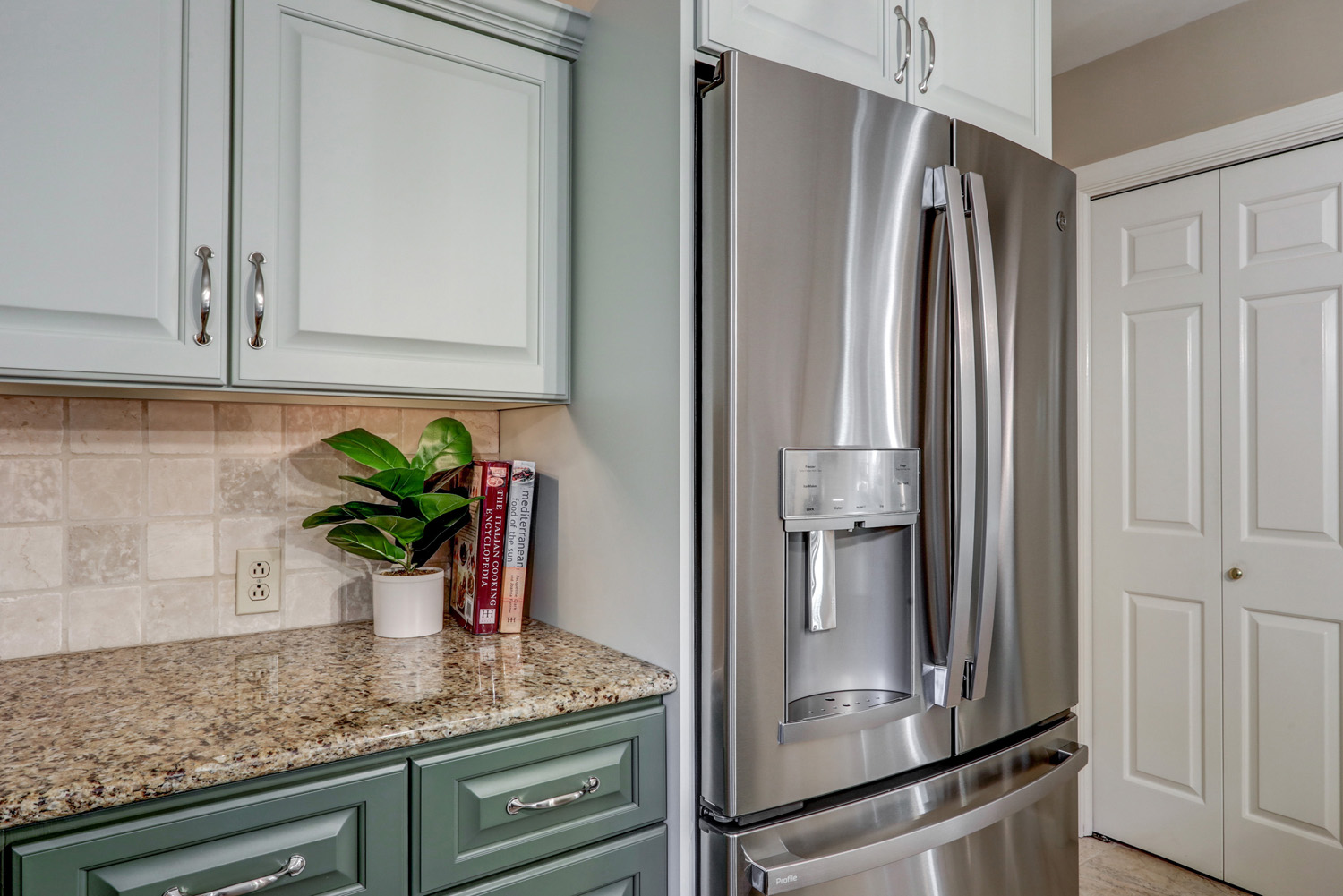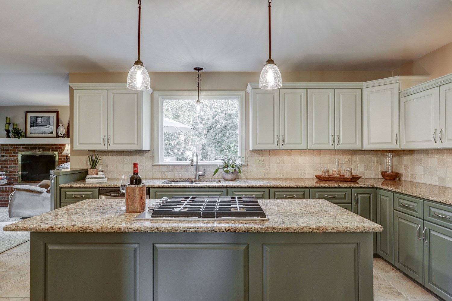 Steve and Susie had no idea they could have dual color cabinets in their kitchen, but once our designer brought the idea to them, they loved it! Since they were keeping the original countertop, they had to find a color that would work with the colors in the countertop. They were able to narrow it down to two; navy blue and sage green. They ended up going with the green for the lower cabinets and the island. For the upper cabinets, they chose a very subtle and lighter shade of green; still drawing in colors from the countertop and tying in the dark green from the lower cabinets.