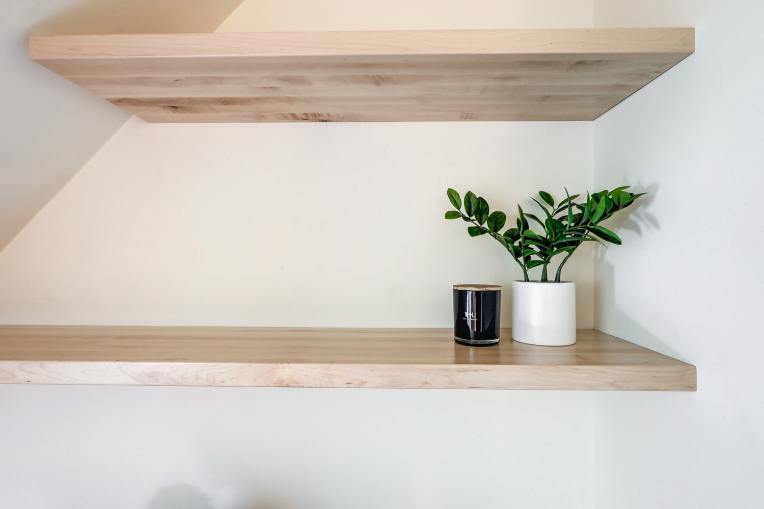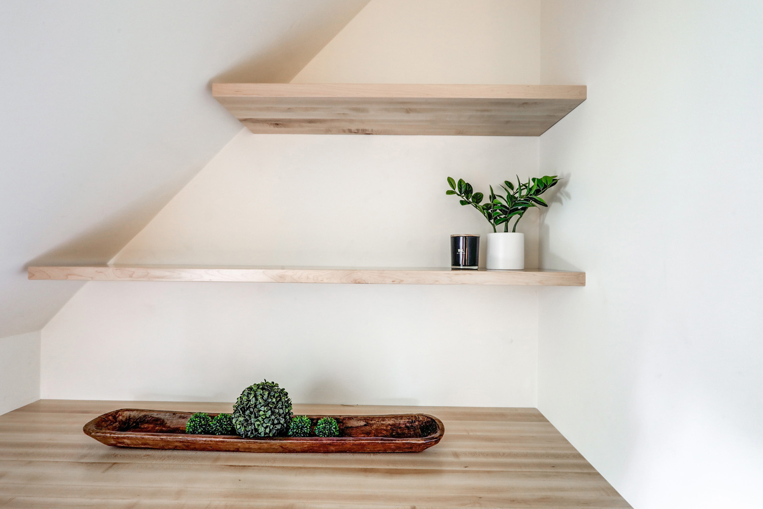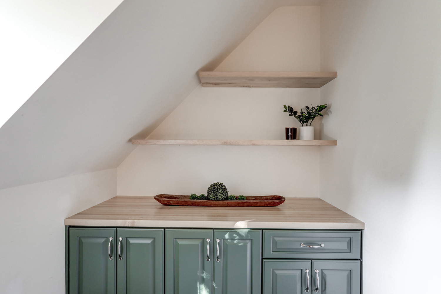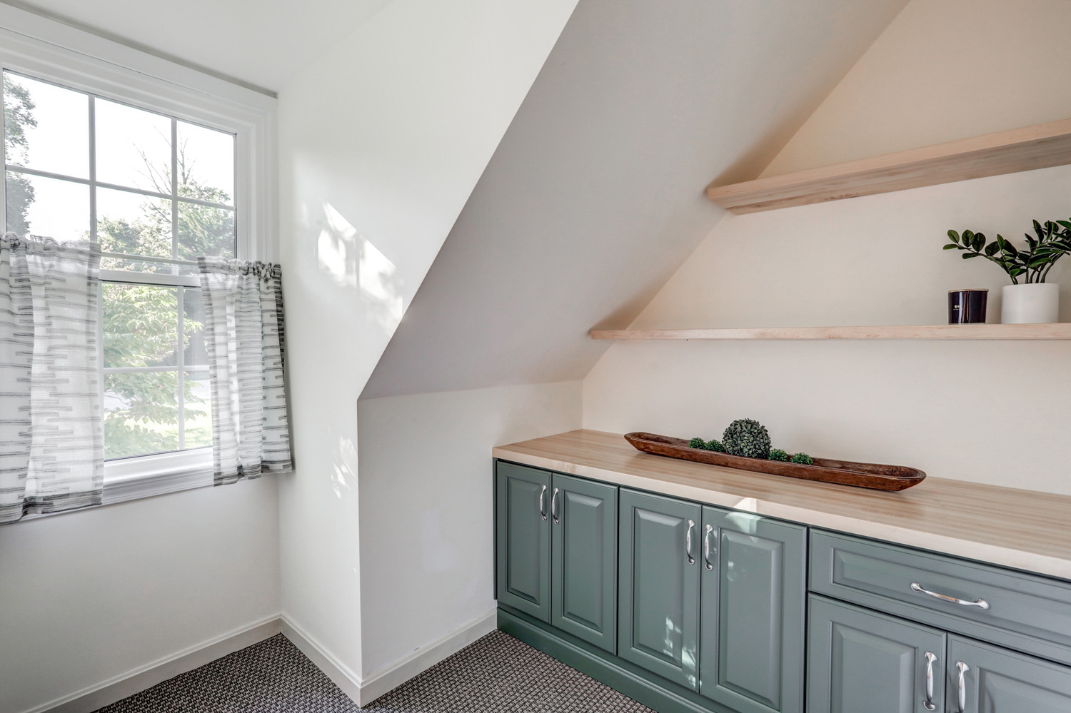 Two smaller projects that were completed while working on the kitchen were the laundry room and home office. We incorporated the green cabinets in both rooms. In the office, we topped the cabinets with a butcher block and used that as shelves as well.